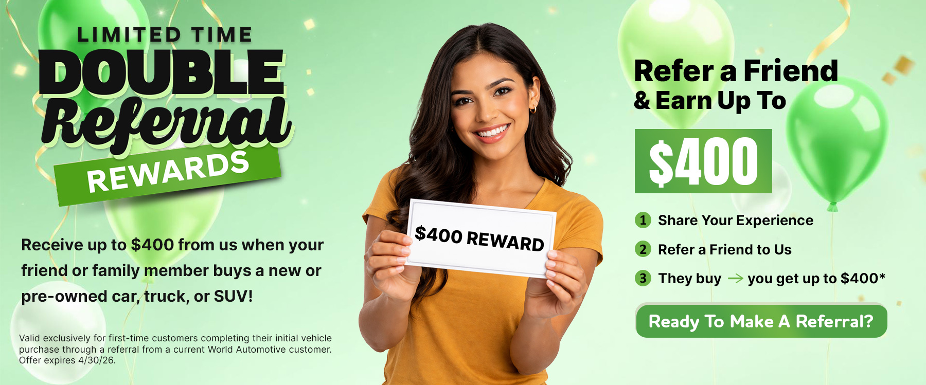 We genuinely appreciate your referrals. It’s because of your voice, your loyalty, and your trust that our community continues to grow—and we want to give back. This April, we’re doubling our referral reward. When your friend buys a car, you get up to $400.